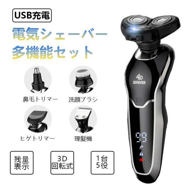 電気シェーバー 男性用 1台5役 水洗い USB充電式 髭剃り メンズ ひげそり 小型 LED残量表示 3枚刃 回転式 IPX7防水 ロック機能 トリマー刃付 日本製刃網