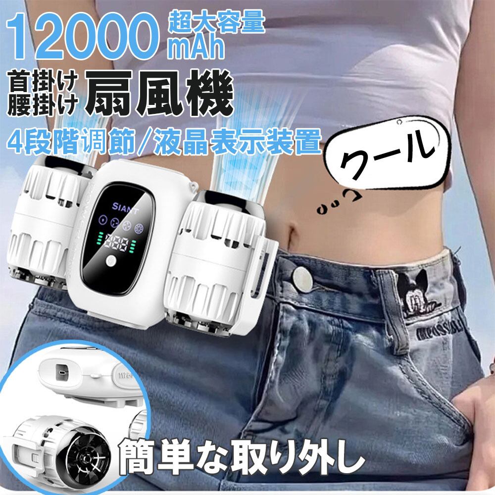 腰掛け扇風機 2024 扇風機 12000mAh 首掛け 多機能扇風機 LED残量表示 静音 大容量 USB充電式 dcモーター 4段階風量調節 屋外作業 熱中症対策
